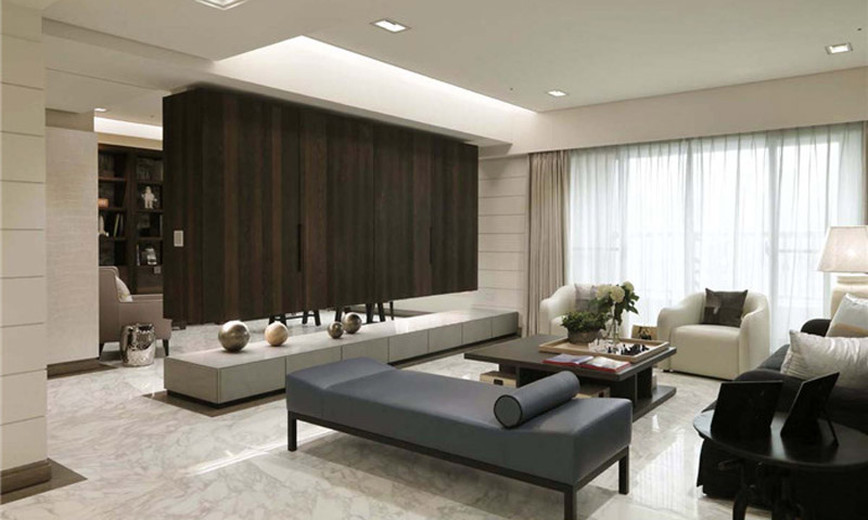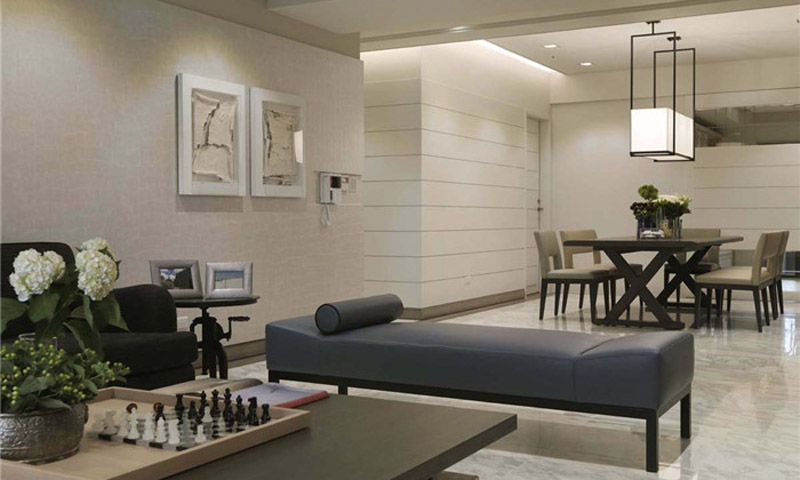 案例說明 本案客廳空間的設(shè)計不拘一格,手法大膽自由,將耀眼的橘色、高貴的天藍色融入空間中,用現(xiàn)代感十足的拼接地毯搭配古典韻味的藝術(shù)雕塑,展現(xiàn)出國際都會的夢幻色彩與超脫浮華的高雅氣質(zhì)。
